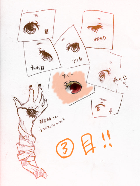 前々回(だっけ?)の「目」のお題のときは、そのまま目ばっかり描いて面白みも何もなかったので、今回はちょっと指向を変えて